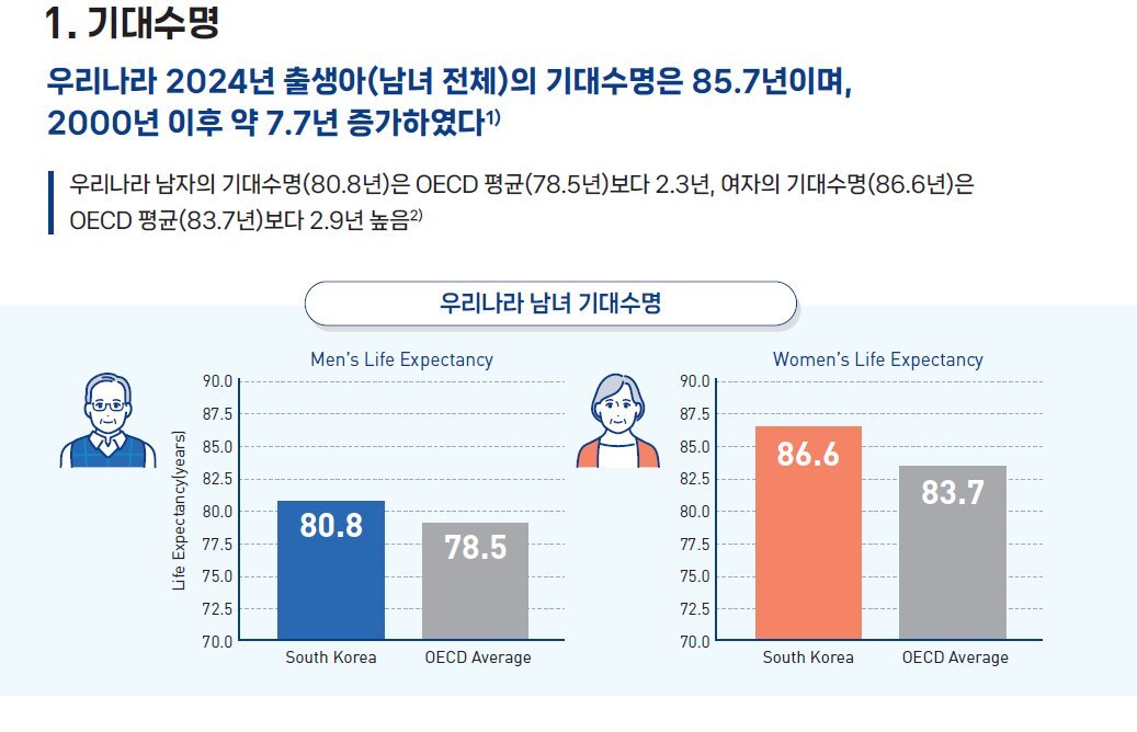 「2025 만성질환 현황과 이슈」에 따르면 우리나라 국민의 기대수명은 2024년 기준 83.7세로 2000년 이후 약 7.7세 증가하였다. 성별로 살펴보면 남자의 기대수명은 80.8년으로 OECD 평균 대비 2.3년 높았으며, 여자의 기대수명은 86.6년으로 OECD 평균 대비 2.9년 높았다.