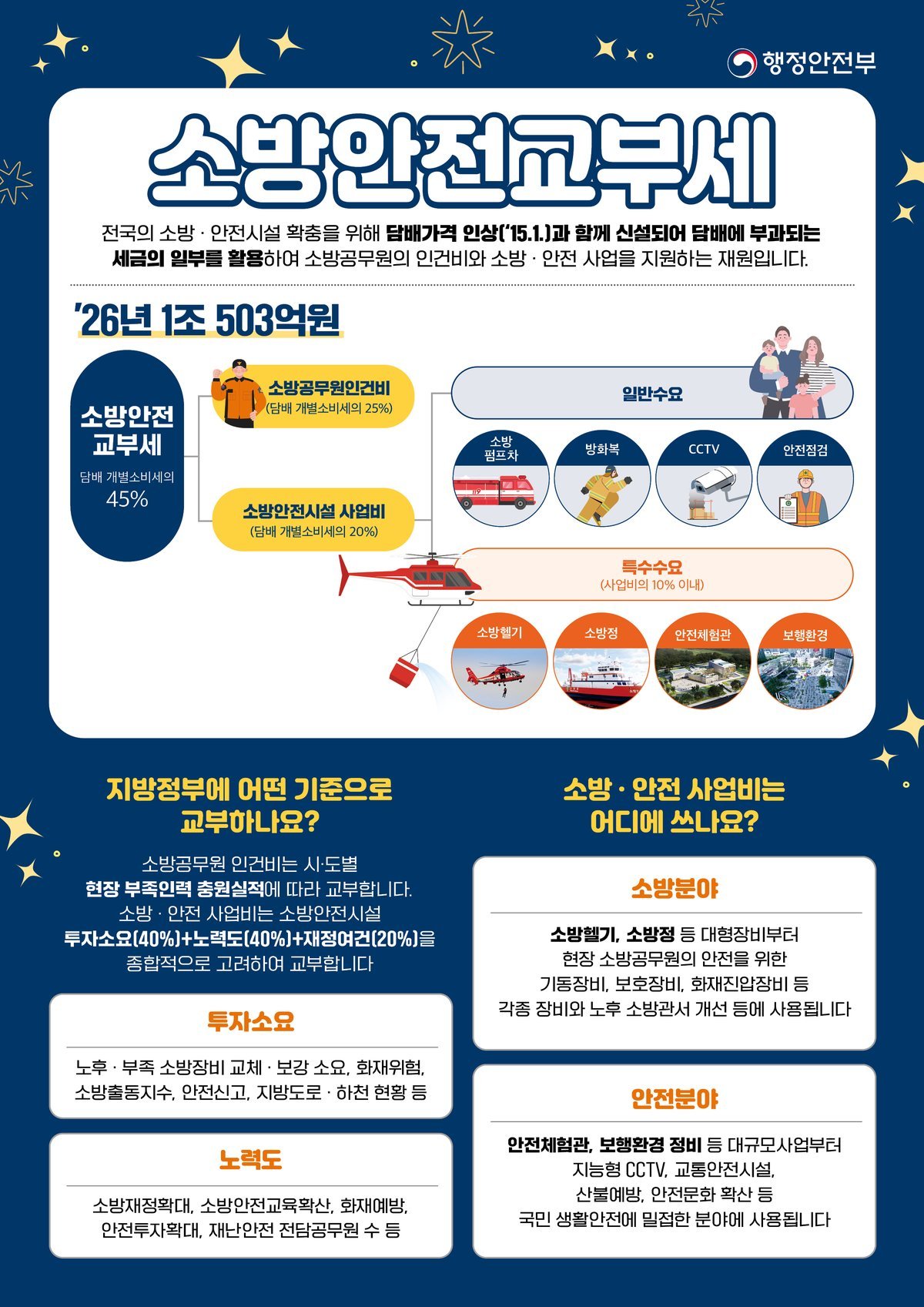 2026년 소방안전교부세 1조 503억 원 가운데 5,835억 원은 소방공무원 인건비로, 4,668억 원은 지방정부의 소방 및 안전 시설·장비 확충 등 안전관리를 위한 사업비에 사용된다.