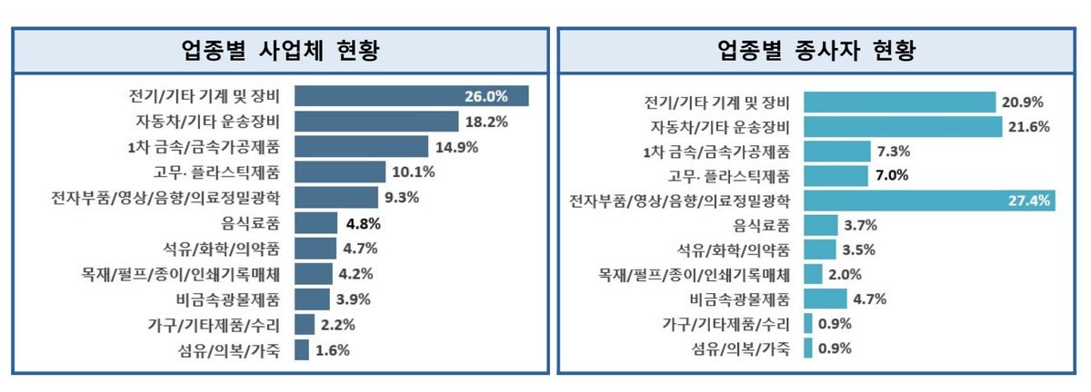 종사자 기준으로는 ‘전자부품/영상/음향/의료정밀광학업’이 27.4%로 가장 많았다.