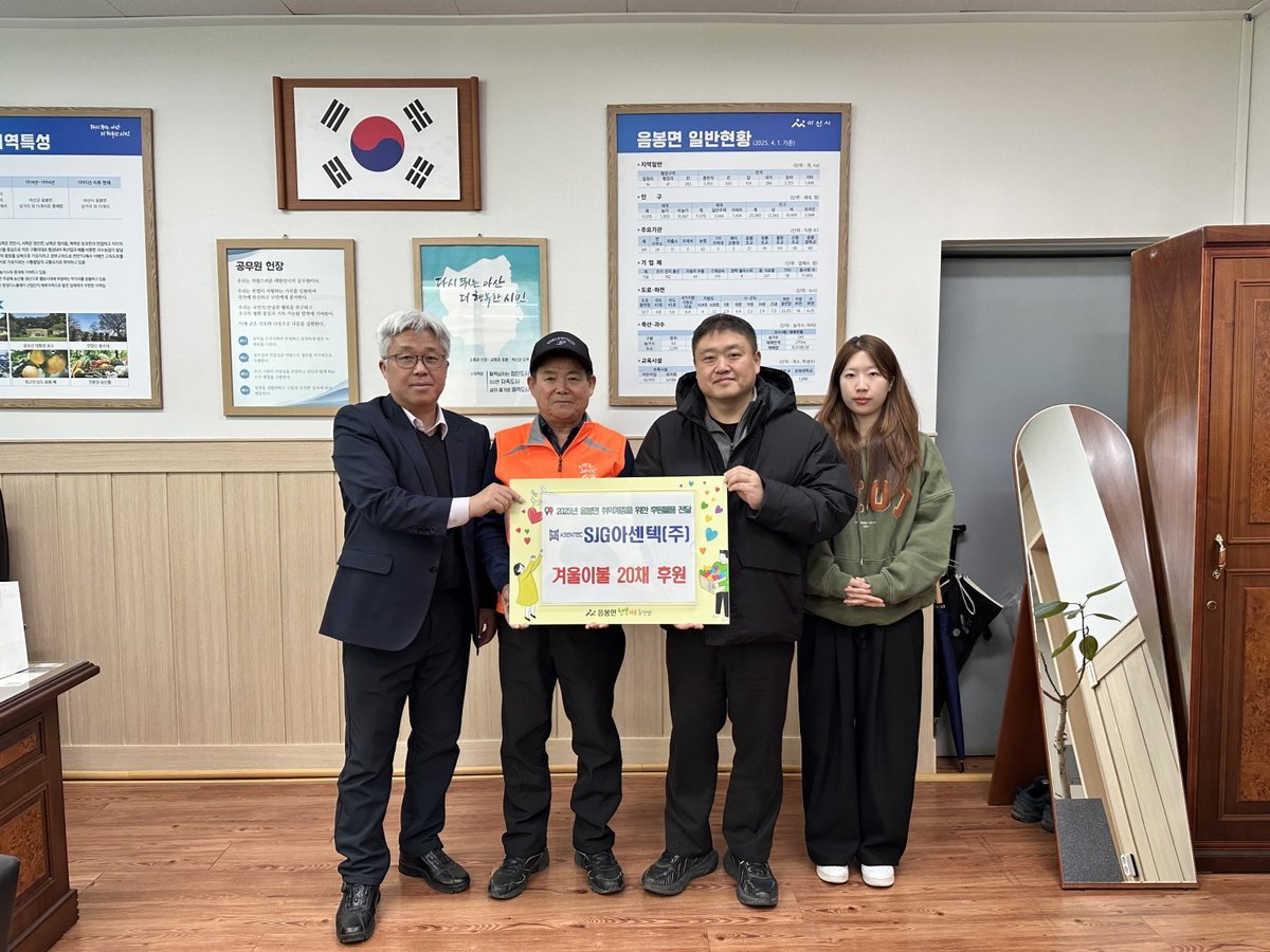 [충청뉴스큐] SJG아센텍㈜은 지난 30일 아산시 음봉면 행복키움추진단에 지역 내 취약계층을 위한 겨울이불 20채를 후원했다.