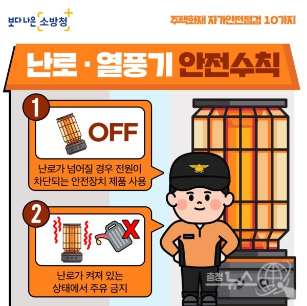 이동식 난로의 안전수칙으로는 ▲난로가 넘어질 경우 전원이 자동으로 차단되는 안전장치가 있는 제품 사용▲난로가 켜진 상태에서 주유 금지▲난로와 열풍기 주변에 인화성 물질 배치 금지▲장시간 사용 자제 등이다.