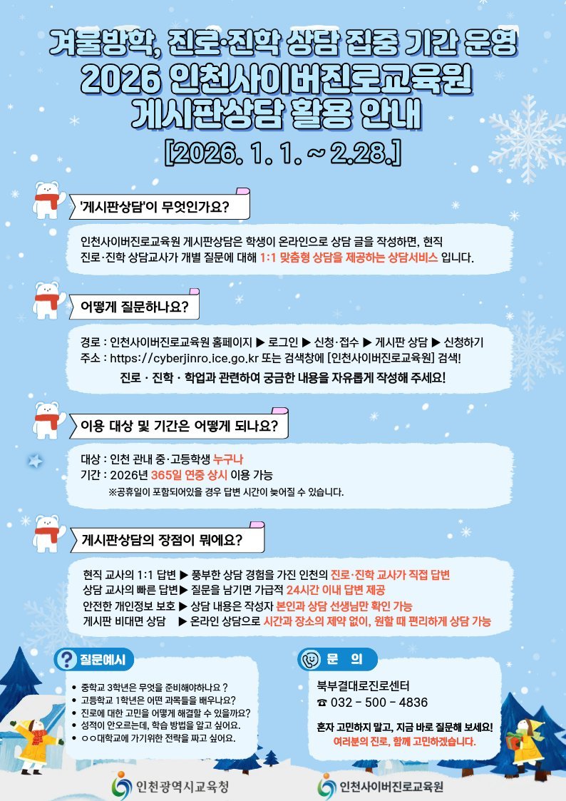 [충청뉴스큐] 인천광역시교육청은 겨울방학을 맞아 중·고등학생들이 새 학년 준비 과정에서 진로와 학업에 대한 고민을 해소할 수 있도록, 인천사이버진로교육원 ‘겨울방학 상담 집중 기간’을 1월부터 2월까지 운영한다.