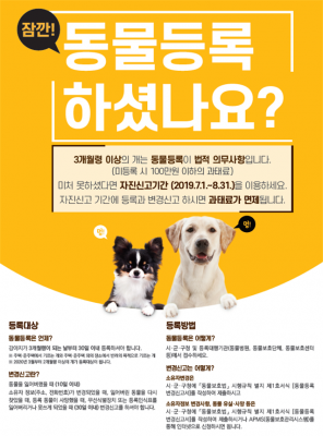 이번 자진신고 기간 내에 동물등록을 하거나, 등록동물의 변경 정보를 신고할 경우‘동물보호법’에 따른 과태료 가 면제된다.