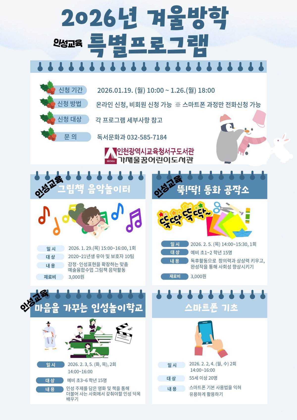 [충청뉴스큐] 인천광역시교육청서구도서관은 ‘2026년 겨울방학 특별프로그램’학습자를 19일 오전 10시부터 선착순으로 모집한다.