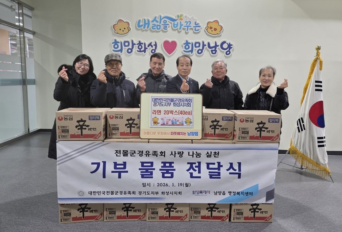 [충청뉴스큐] 대한민국전몰군경유족회 경기도지부 화성시지회가 지난 19일 남양읍행정복지센터에 지역 내 어려운 이웃들을 돕기 위한 라면 20박스를 기탁하며 따뜻한 나눔의 뜻을 전했다.