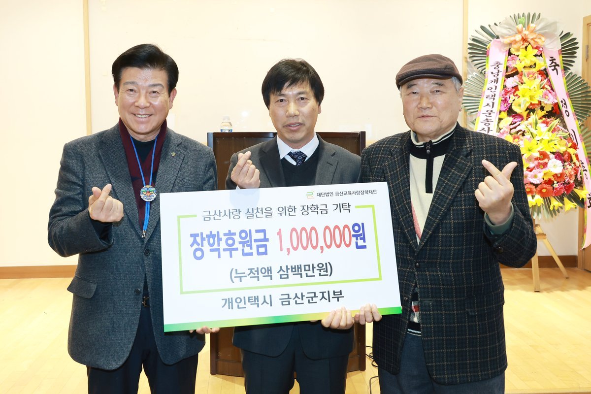 박범인 금산군수는 "지역 경제가 어려운 상황에서도 따뜻한 마음을 전해주신 개인택시 금산군지부에 감사드린다"며 "기부금은 학생들의 학업 지원과 장학사업에 소중히 사용해 학생들이 더 큰 꿈을 펼칠 수 있도록 돕겠다"고 전했다.