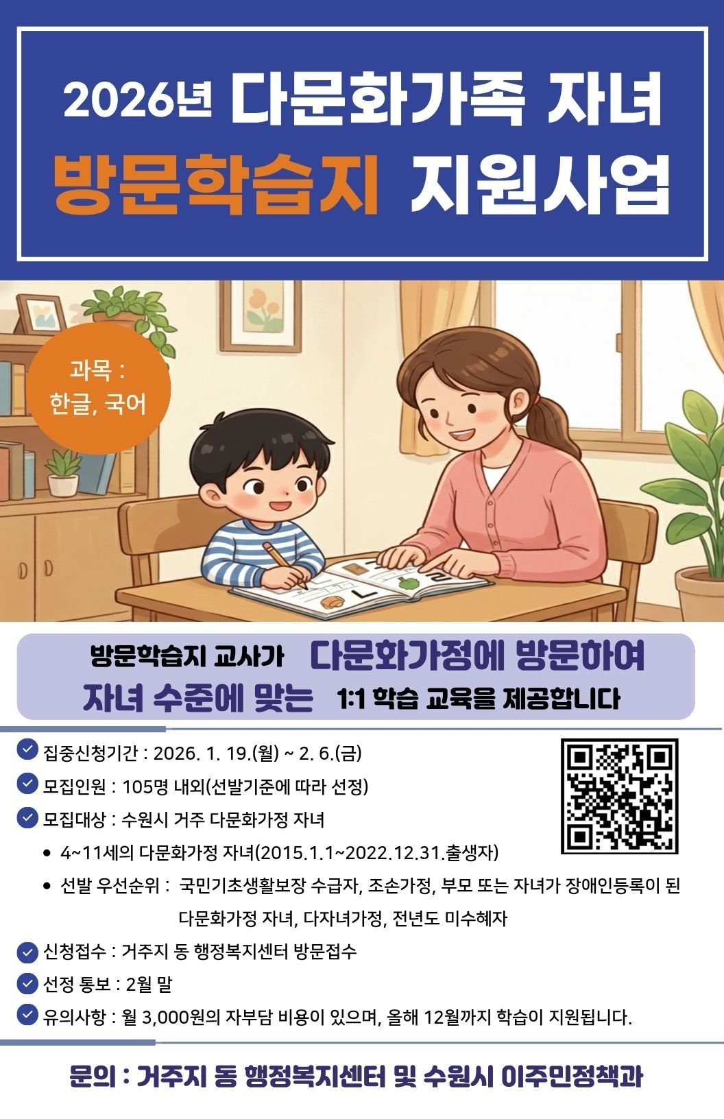[충청뉴스큐] 수원특례시가 다문화가족 자녀에게 한글·국어 방문학습을 지원하는 ‘2026 다문화가족 자녀 방문학습지 지원 사업’참여자를 2월 6일까지 모집한다.