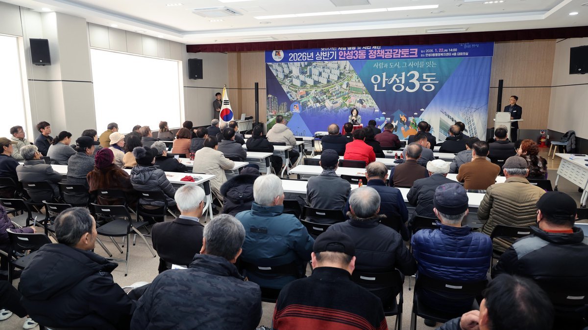 이번 정책공감토크는 2026년 안성시의 시정 운영 방향을 공유하고 안성3동의 현안과 발전 방향을 주민들과 함께 만들어가기 위해 마련됐으며 안성3동 주민자치센터 민요반의 식전 공연을 시작으로 시정 브리핑, 안성3동 현안 발표, 2025년 하반기 건의 사항 검토 결과 순으로 진행됐다.
