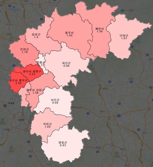 충북의 지가변동률은 1.82%로 전국 평균 변동률 보다 1.54%p 낮았다.