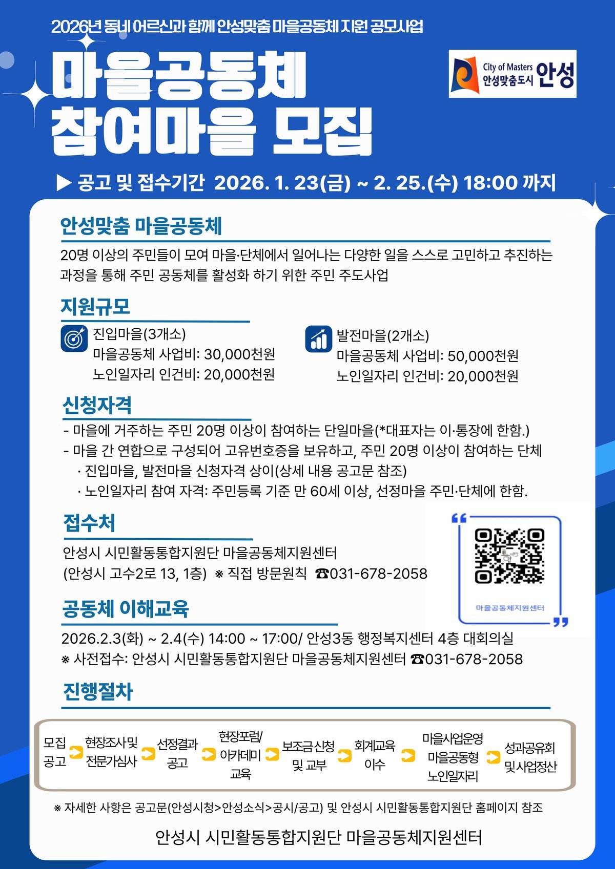 이번 공모는 ‘2026년 동네 어르신과 함께하는 안성맞춤 마을공동체 지원’과 ‘2026년 안성맞춤 시민동아리 지원’등 2개 분야로 진행된다.