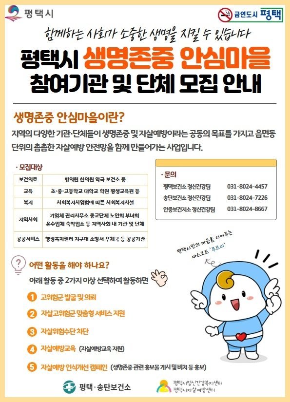 ‘생명존중 안심마을’사업에 참여를 희망하는 기관이나 단체는 평택시 정신건강복지센터로 문의하면 된다.