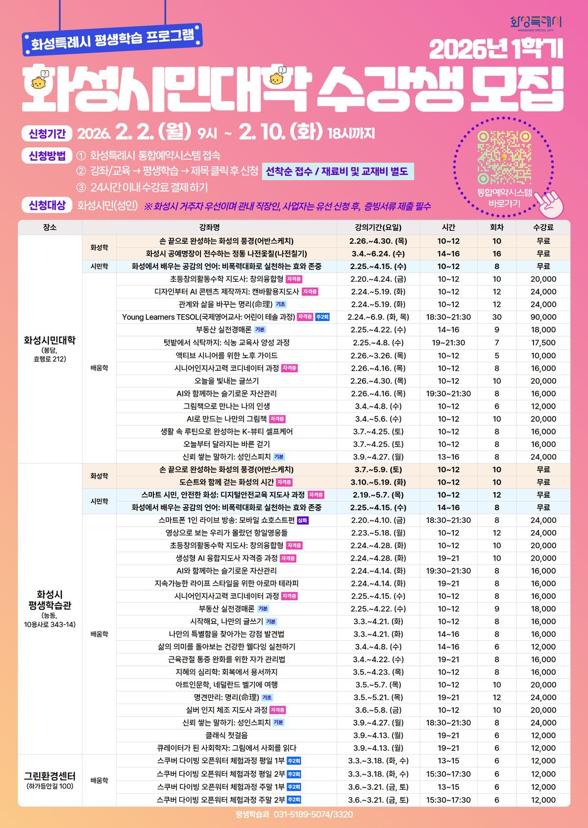 [충청뉴스큐] 화성특례시는 2026년 1학기 화성시민대학 수강생을 다음 달 2일부터 10일까지 선착순 모집한다고 27일 밝혔다.