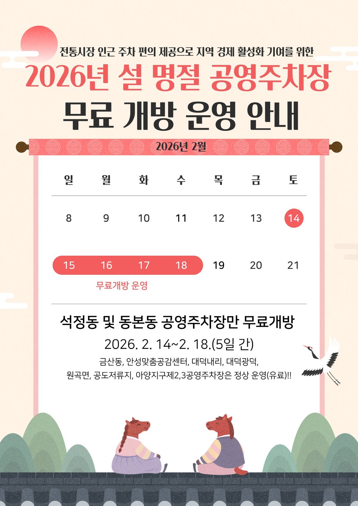 [충청뉴스큐] 안성시시설관리공단은 2026년 설 명절을 맞아 2월 14일부터 18일까지 5일간, 공단이 관리하는 공영주차장 중 전통시장 인근에 위치한 석정 동 공영주차장과 동본동 공영주차장을 한시적으로 무료 개방한다고 밝혔다.