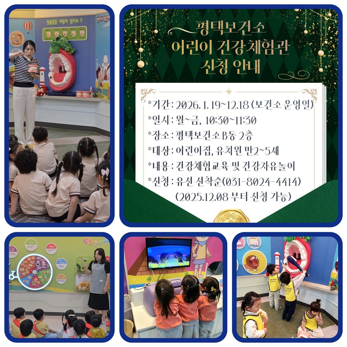 평택보건소 어린이 건강체험관은 지난 2016년부터 운영을 시작했으며 어린이 눈높이에 맞춘 다양한 시각 자료와 교구를 활용해 건강 지식을 놀이처럼 쉽고 재미있게 배울 수 있도록 구성된 통합 체험형 교육 공간이다.