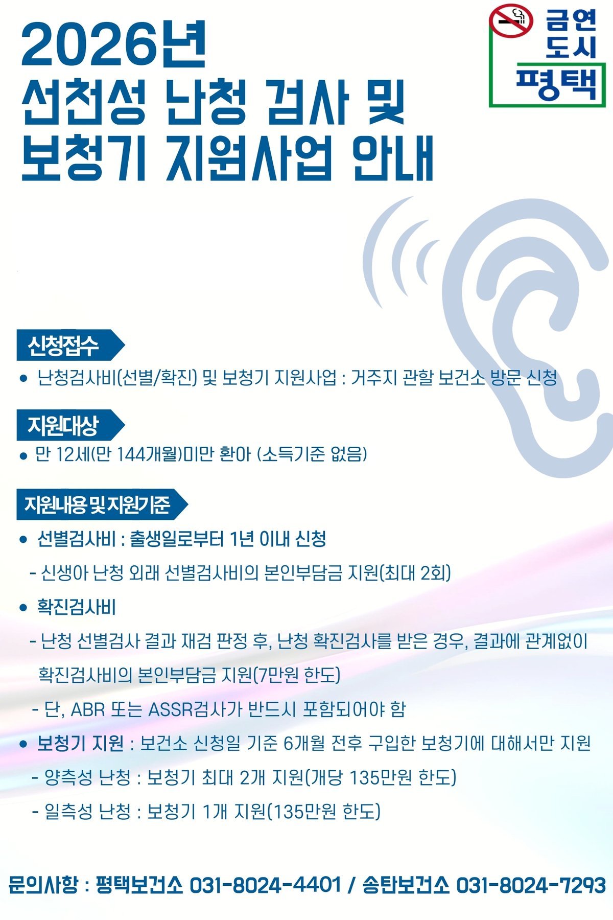 평택보건소 관계자는 “사업 대상 확대를 통해 난청 아동들이 더 적기에 적절한 지원을 받을 수 있을 것으로 기대된다”며 “앞으로도 아동의 건강한 성장과 발달을 위해 지속적인 지원을 강화하겠다”고 밝혔다.