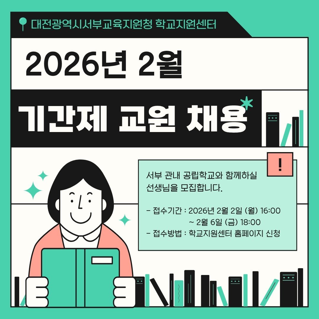 [충청뉴스큐] 대전서부교육지원청 학교지원센터는 학교 현장의 교원 공백 해소와 행정 부담 완화를 위해 ‘2026년도 제1차 관내 공립학교 기간제 교원 공개 채용’을 실시한다고 밝혔다.
