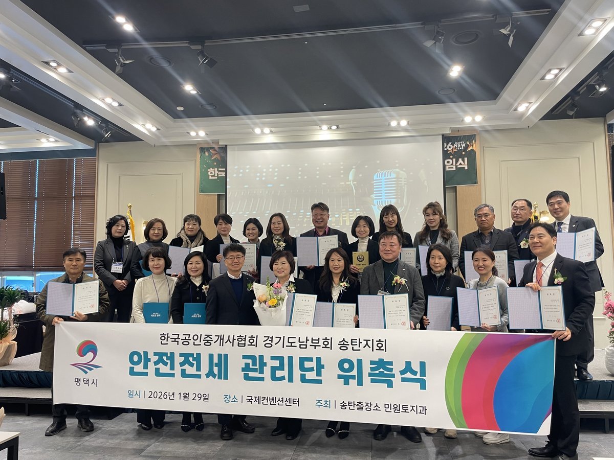 [안전전세 관리단 주요 직무] - 이상 거래 상시 모니터링: 중개사고 의심 사례에 대한 정보 수집 및 공유 - 자율 정화 활동: 공인중개사 윤리 의식 강화 및 건전한 중개 질서 확립 주도 - 안전전세 캠페인 전개: 시민 대상 전세 사기 예방 홍보 및 정책 확산 - 이행확인 점검: ‘안전전세 길목 지킴 운동’등 민관 합동 예방책 준수 여부 확인 송탄출장소는 이번 관리단 출범을 기점으로 과거 관 주도의 일방향적인 지도·단속 체계에서 벗어나 현장 전문가 중심의 ‘민관 합동 자율적 예방 시스템’으로 패러다임을 전환하겠다는 방침이다.