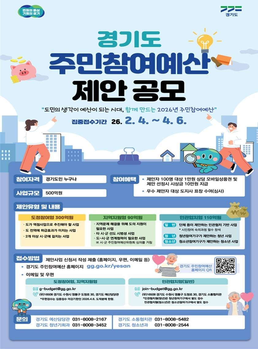 [충청뉴스큐] 경기도가 2026년 주민참여예산 반영을 위한 주민제안사업을 2월 4일부터 4월 6일까지 집중 접수한다.