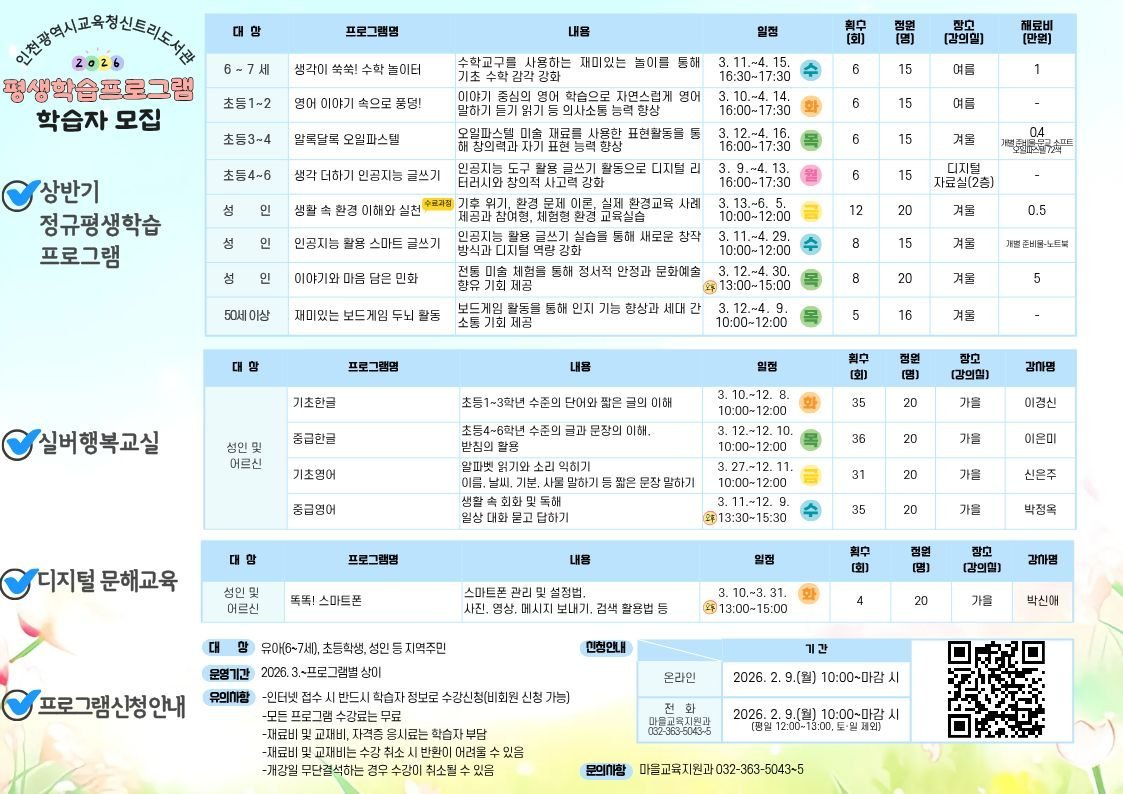 [충청뉴스큐] 인천광역시교육청신트리도서관은 지역 주민의 생애주기별 학습 기회 제공을 위해 2026년 상반기 평생학습프로그램 학습자를 모집한다.