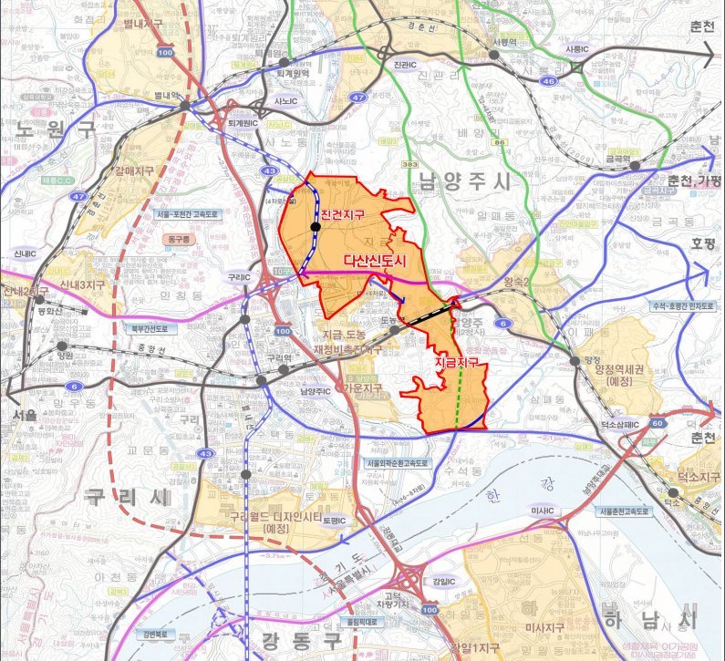 다산신도시는 남양주시 다산동 일원 약 475만㎡ 부지에 조성된 신도시로 진건 및 지금지구로 구성된다.