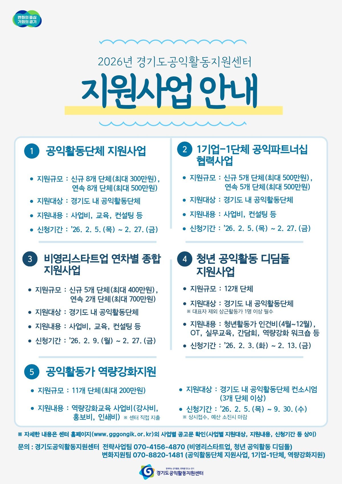 기타 문의는 경기도공익활동지원센터 전략사업팀 또는 변화지원팀으로 하면 된다.