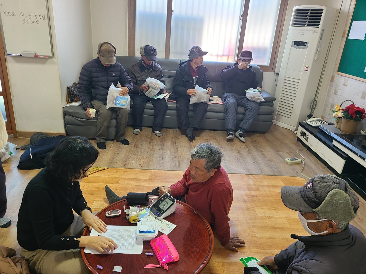 [사진5설명] : 충남 계룡시가 향한1리 경로당을 찾아가 건강취약계층 대상으로 한파 및 낙상 예방 건강교육을 실시하고 있다.