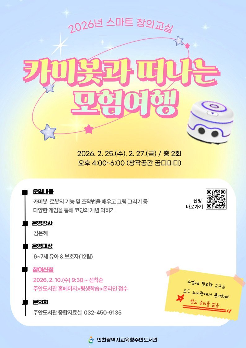 [충청뉴스큐] 인천광역시교육청주안도서관은 스마트창의교실의 일환으로 ‘카미봇과 떠나는 모험여행’참여자를 모집한다.