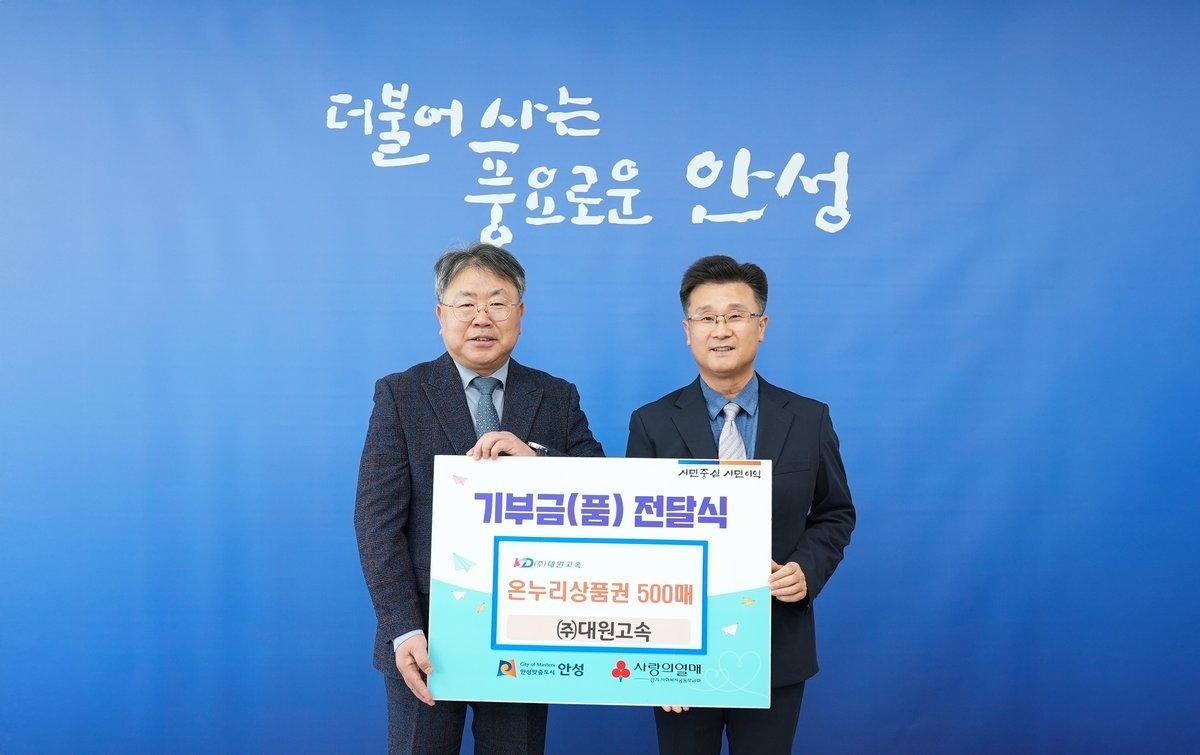 [충청뉴스큐] 안성시는 2월 3일 대원고속으로부터 지역의 어려운 이웃을 돕기 위한 온누리상품권 500매를 전달받았다고 밝혔다.