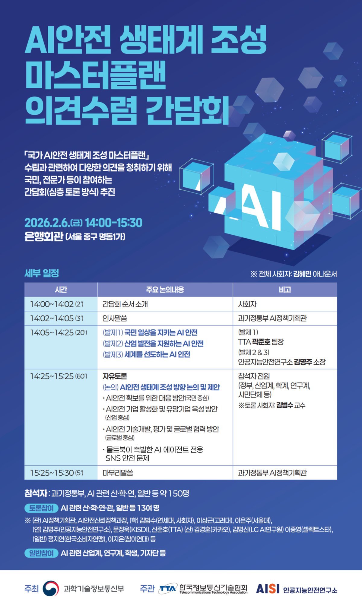 [충청뉴스큐] 과학기술정보통신부가 주최하고 한국정보통신기술협회와 인공지능 안전연구소가 주관하는「국가 인공지능 안전 생태계 조성 종합계획」 의견수렴 간담회를 2월 6일 14시 서울 중구 은행회관 국제회의실에서 개최한다고 밝혔다.
