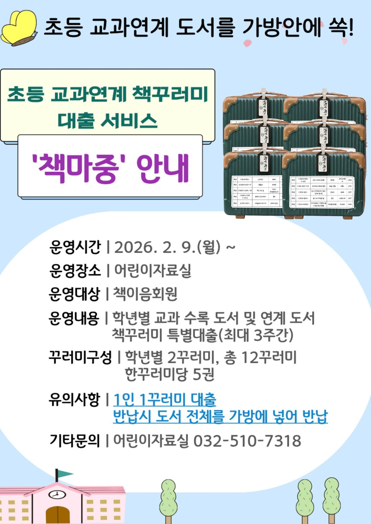 [충청뉴스큐] 인천광역시교육청부평도서관은 9일부터 어린이자료실에서 초등교과 연계 책꾸러미 대출 서비스 ‘책마중’을 운영한다.