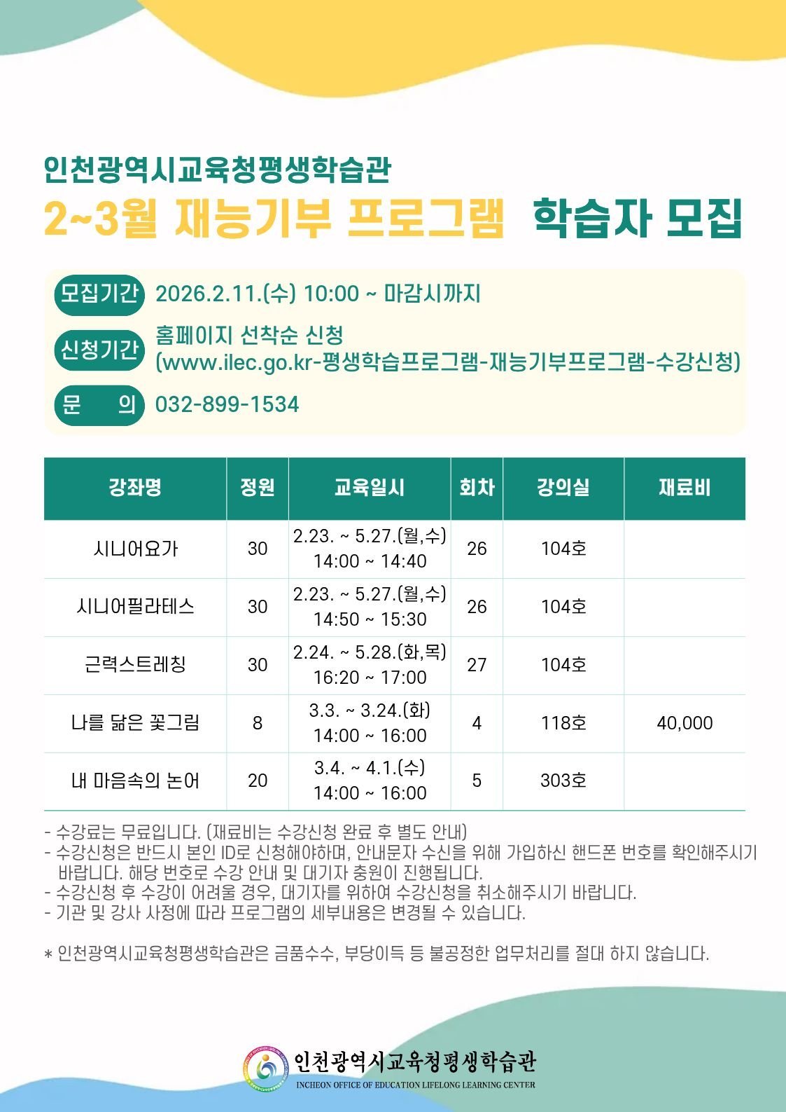 2월부터 운영되는 강좌는 ‘시니어 요가’, ‘시니어 필라테스’, ‘근력 스트레칭’, ‘나를 닮은 꽃그림’, ‘내 마음속의 논어’등 총 5가지이다.
