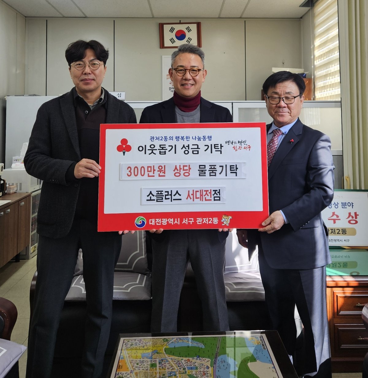 같은 날, 관저2동은 소플러스 서대전점으로부터 300만원 상당의 생필품 세트 100여 개를 전달받았다.