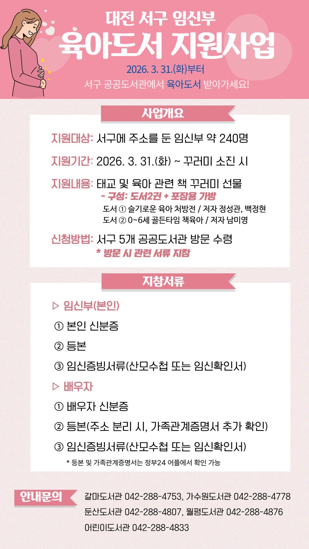 [충청뉴스큐] 대전 서구 공공도서관은 3월 31일부터 '임신부 육아 도서 지원사업'을 운영한다.