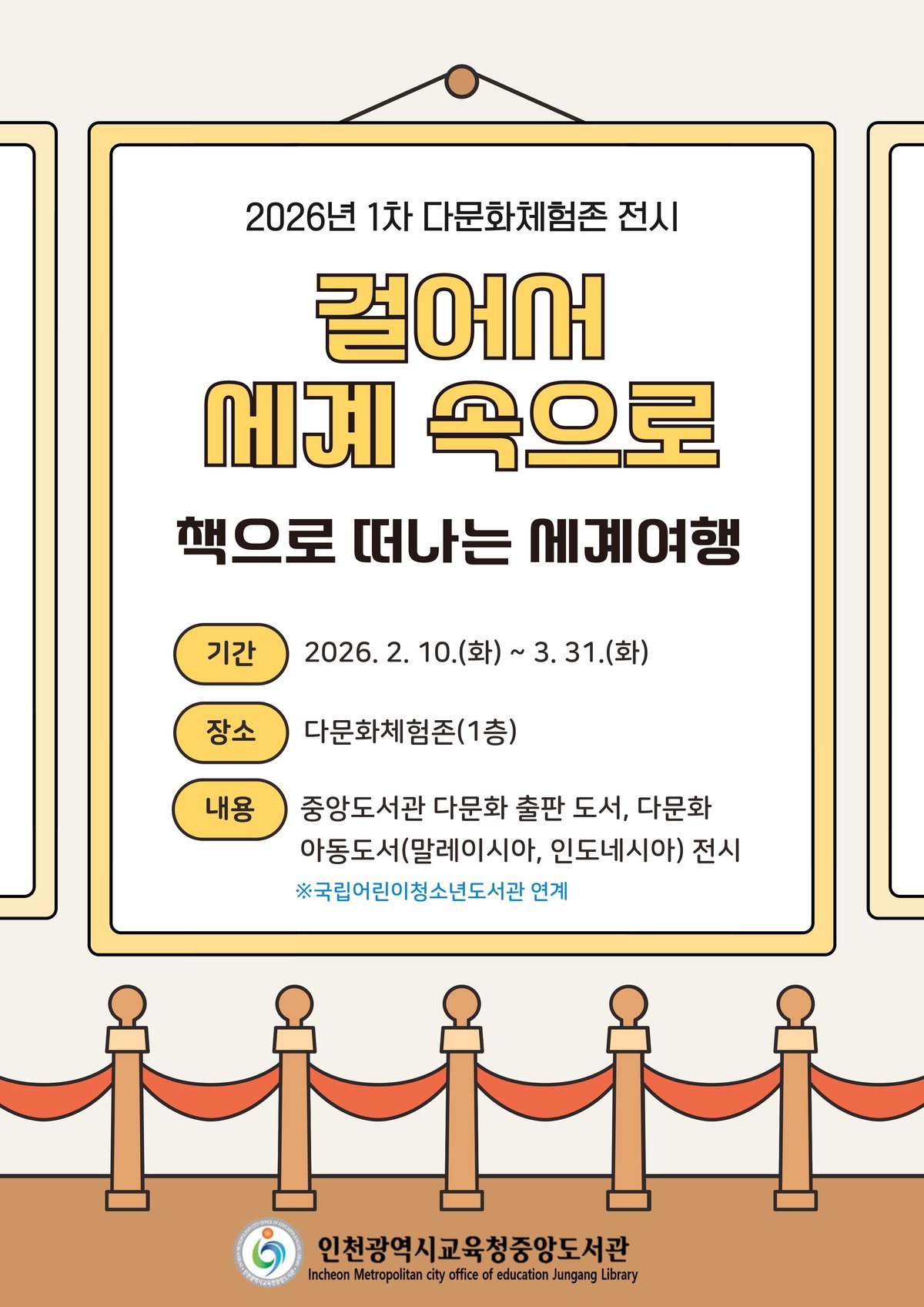 [충청뉴스큐] 인천광역시교육청중앙도서관은 2월 10일부터 3월 31일까지 1층 다문화체험존에서 ‘책으로 떠나는 세계여행’전시를 개최한다.