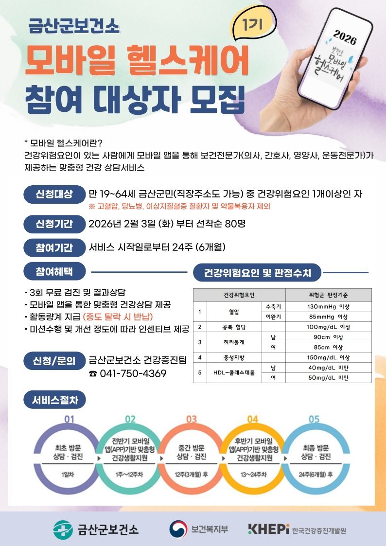[충청뉴스큐] 금산군보건소는 2월 9일부터 2026년 모바일 헬스케어 1기 대상자 80명을 선착순 모집한다.
