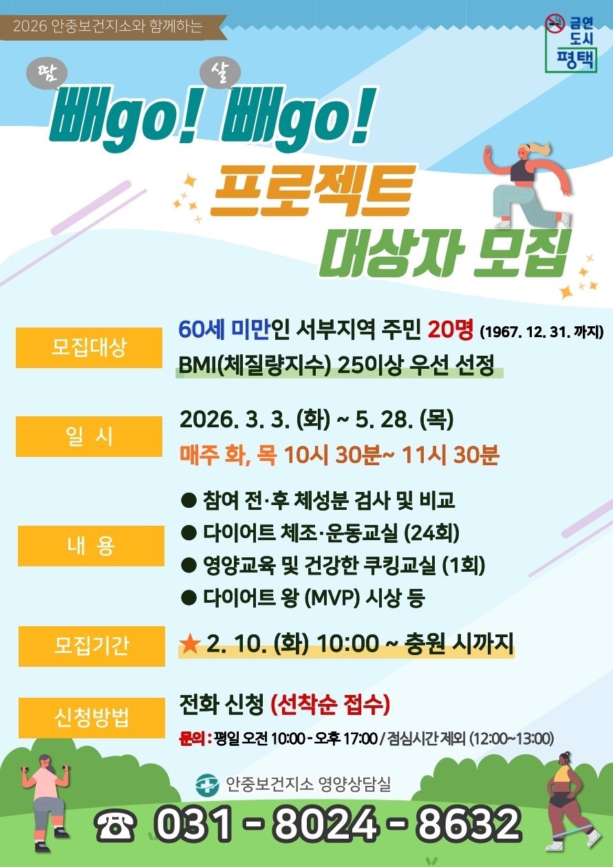 [충청뉴스큐] 평택시 안중보건지소는 지역 주민의 건강한 체중 관리와 비만 예방을 위해 상반기 ‘빼go 빼go 프로젝트’프로그램을 운영하고 참여자를 모집한다고 밝혔다.