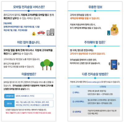 대상세목은 재산세, 주민세, 자동차세, 등록면허세이며, 금융사의 간편결제 앱과 금융 앱 등 모바일 앱을 통해 전자고지서를 받아 볼 수 있다.
