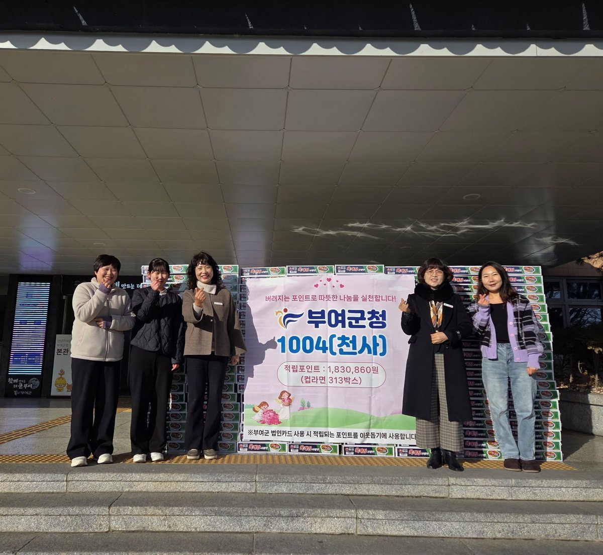 [충청뉴스큐] 부여군은 부여군 법인카드 사용 시 적립된 포인트 183만원을 활용해 관내 저소득 취약계층에 컵라면 313박스를 전달했다고 밝혔다.