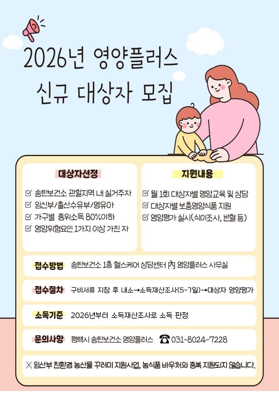 [충청뉴스큐] 평택시 송탄보건소에서는 임산부와 영유아의 건강한 미래를 위한 영양플러스 사업을 연중 운영하고 있다고 밝혔다.