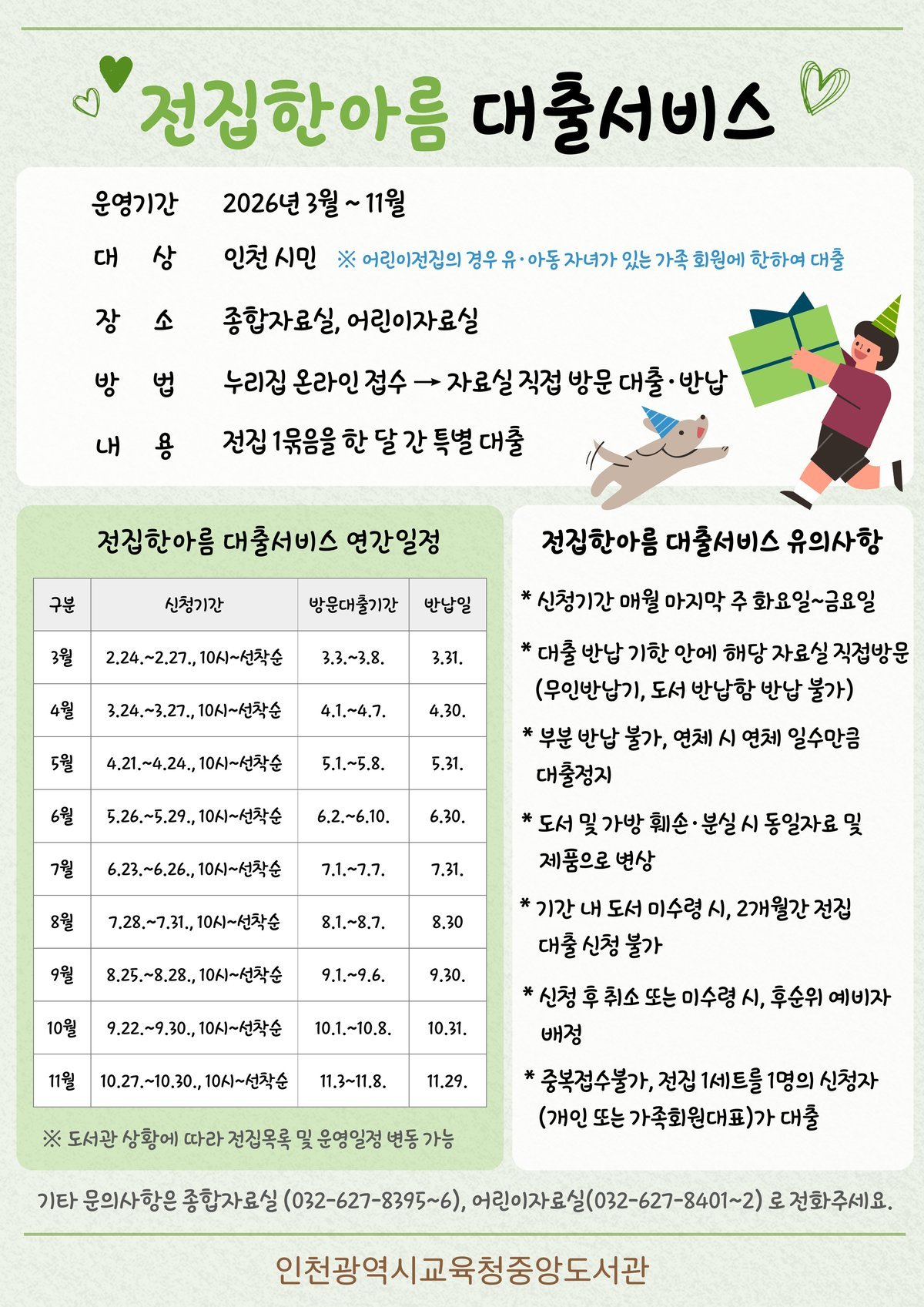 [충청뉴스큐] 인천광역시교육청중앙도서관은 지역주민에게 다양한 독서 기회를 제공하기 위해 3월부터 11월까지 ‘전집한아름 대출서비스’를 운영한다.