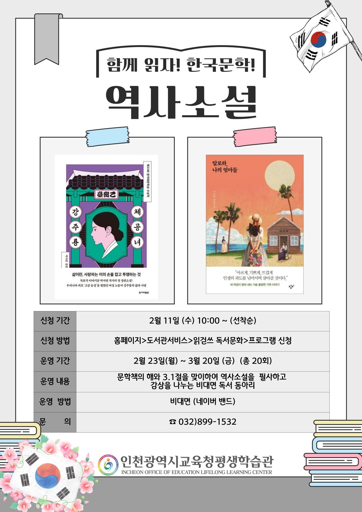 이번 독서동아리는 세계 각국의 다양한 소설을 매월 주제별로 선정해 운영되며 2월에는 일제강점기 배경의 우리 역사소설 2권을 필사하고 도서에 대한 감상을 나누며 23일부터 4주간 비대면으로 운영한다.