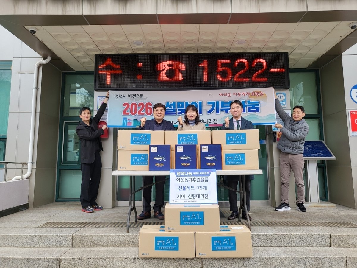 [충청뉴스큐] 기아 신평대리점은 10일 설 명절을 맞아 평택시 비전2동 행정복지센터에 지역 내 취약계층을 위한 명절 선물 세트 75박스를 기부했다.