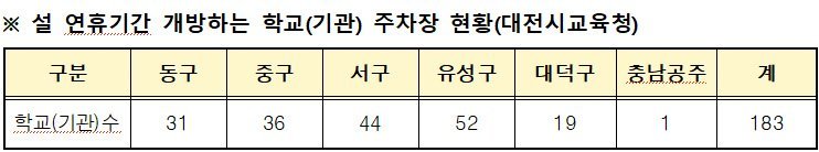 [충청뉴스큐] 대전시교육청은 설 연휴 기간인 2월 14일부터 18일까지 대전을 찾는 귀성객과 지역 주민의 주차 편의를 위해 관내 각급 학교와 교육청, 산하기관 등 총 183곳의 주차장을 무료로 개방한다고 밝혔다.