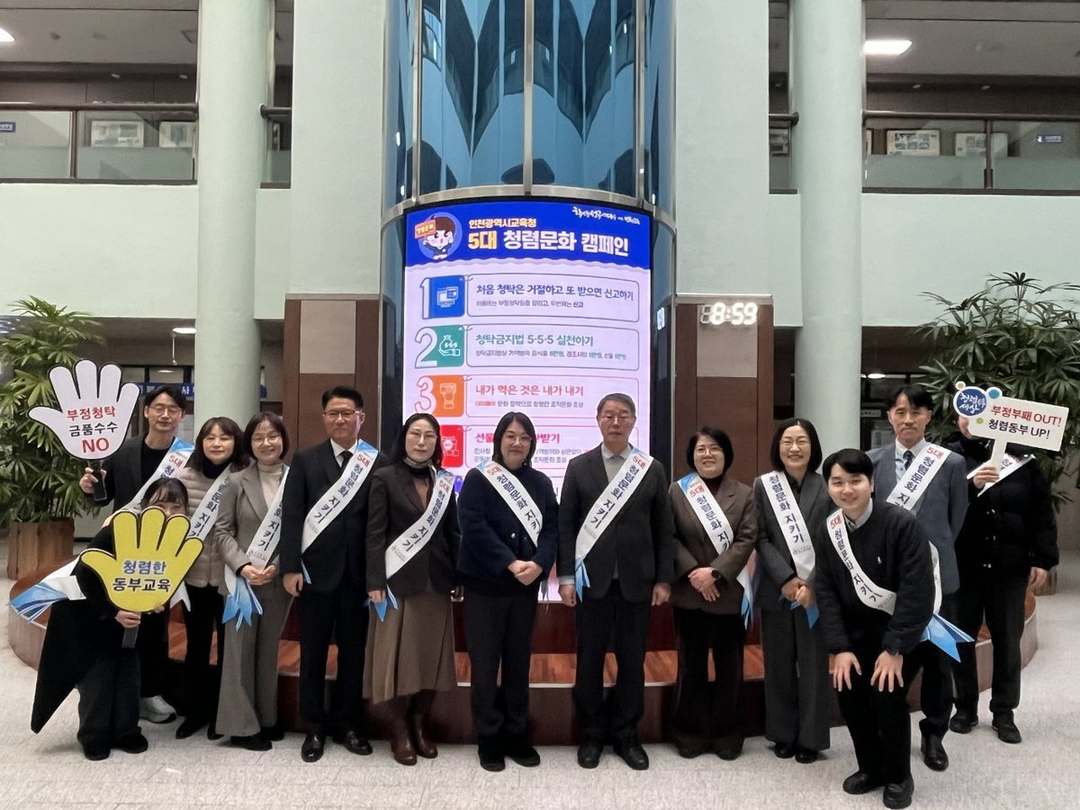 이번 캠페인은 내부 공직기강을 확립하고 교육청을 방문하는 시민에게 인천교육의 ‘5대 청렴 문화’를 알려 지역사회 전반에 청렴 의식을 확산시키고자 마련했다.