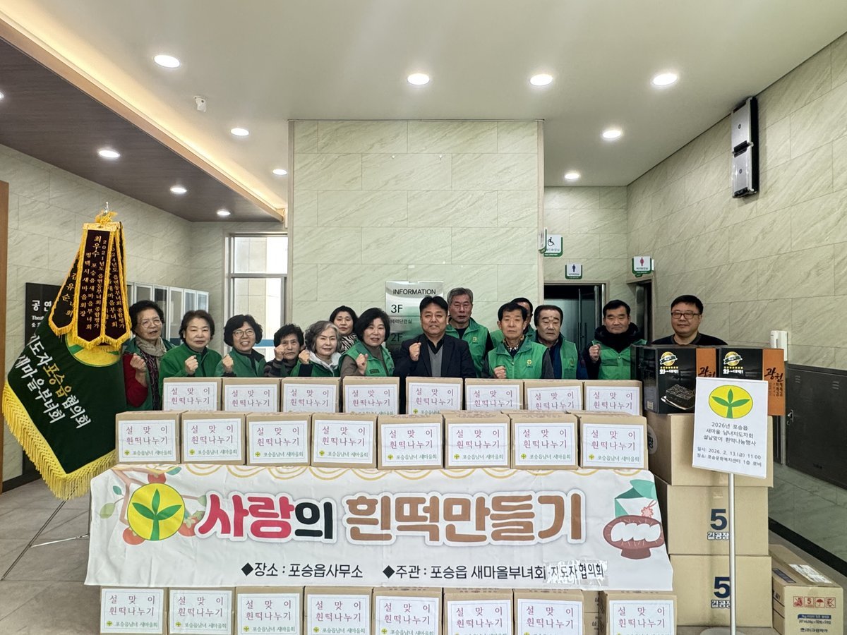 [충청뉴스큐] 평택시 포승읍 새마을남·여 지도자회는 다가오는 설 명절을 맞아 지난 13일 관내 소외된 이웃들을 위한 ‘설맞이 사랑의 흰떡 나눔’행사를 진행해 이웃 사랑을 실천하며 따뜻하고 풍성한 설 명절 분위기 조성했다.