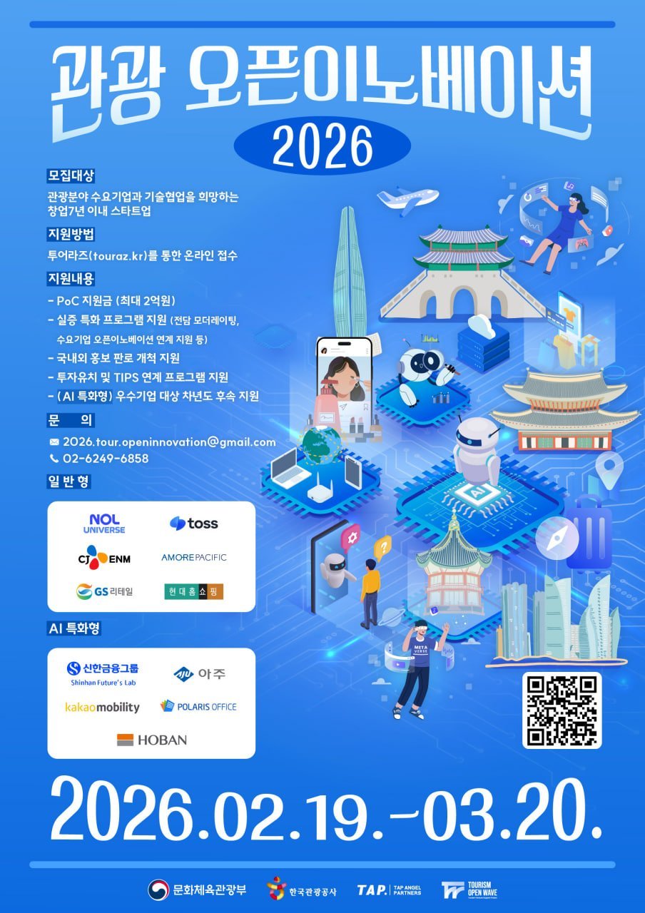 [충청뉴스큐] # HINT: 한국관광공사, '2026 관광 오픈이노베이션 사업'참여 스타트업 모집 ### HINT: 일반형·AI 특화형 선발, 기업당 실증화 자금 최대 2억원 등 전폭 지원 ### HINT: 문화체육관광부와 한국관광공사는 오는 3월 20일까지 '2026 관광 오픈이노베이션 사업'공모를 통해 대·중견기업과 협업할 관광 스타트업을 모집한다.