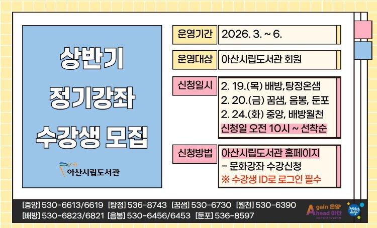 수강 신청은 2월 19일 오전 10시부터 아산시립도서관 홈페이지에서 선착순으로 진행된다.