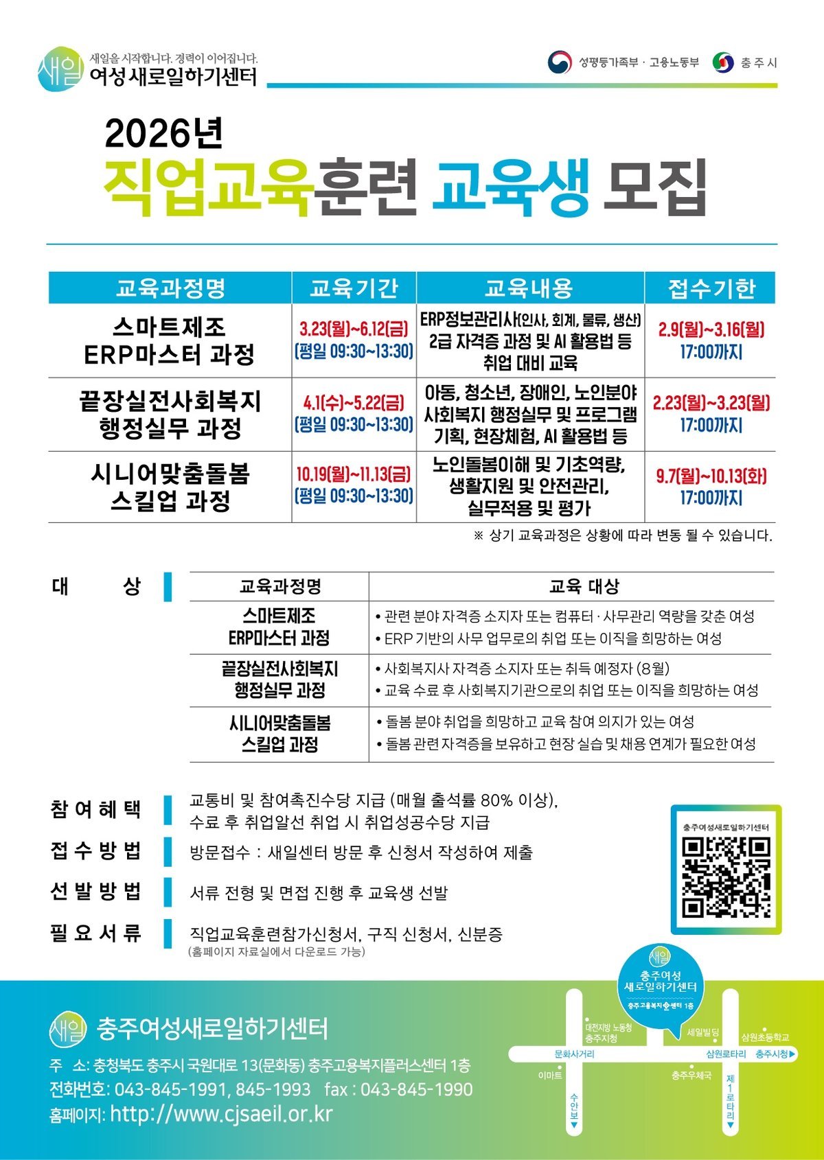 [충청뉴스큐] 충주여성새로일하기센터가 성평등가족부, 고용노동부, 충주시와 함께 여성의 경제활동 촉진과 취업 지원을 위해 2026년 국비 지원 직업교육훈련 교육생을 모집한다고 19일 밝혔다.