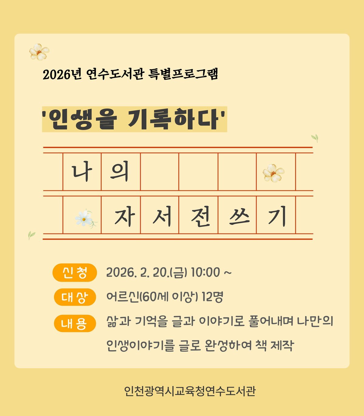 [충청뉴스큐] 인천광역시교육청연수도서관은 어르신의 삶을 기록하고 소중한 인생 이야기를 한 권의 책으로 엮는 ‘어르신 자서전 쓰기’프로그램 참여자를 20일부터 모집한다.
