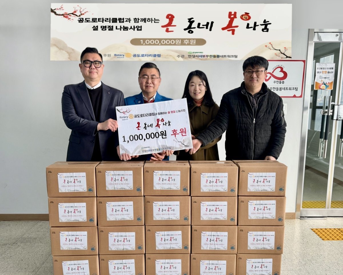 [충청뉴스큐] 사회복지법인 한길복지재단이 수탁 운영하는 안성시서부무한돌봄네트워크팀은 국제로타리 3600지구 공도로타리클럽과 지난 12일 설 명절 나눔사업 ‘온동네 복나눔’후원금 100만원 전달식을 가졌다.